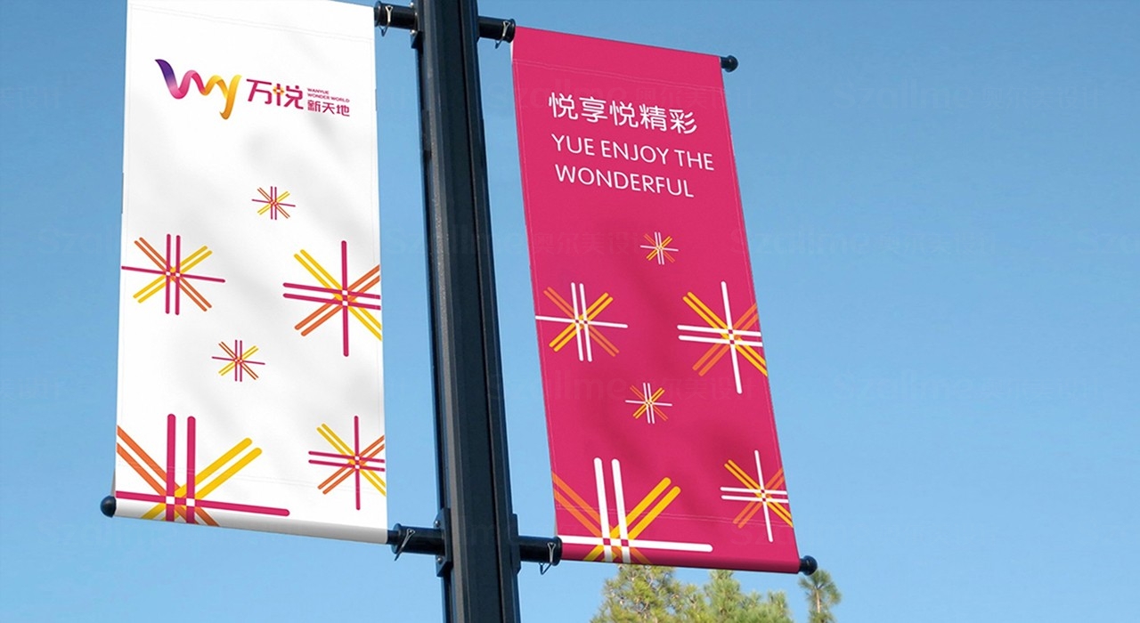 标志以万悦首字母"y"作为创作主体,根据海南热带式建筑,海浪式的屋顶进行设计,融入三亚市花三角梅的华丽与热情气质以紫色、粉红、銫渐变形成动感活力的形态,代表出万悦永恒、阳光、快乐、和引领时尚潮流。在字体"悦"字上突显出三亚独特的热带季风气候,以阳光为点,构建出活动向上的形态;同时也象正在绽放花朵的三角梅;散发出缤纷、精彩活力的魅力。