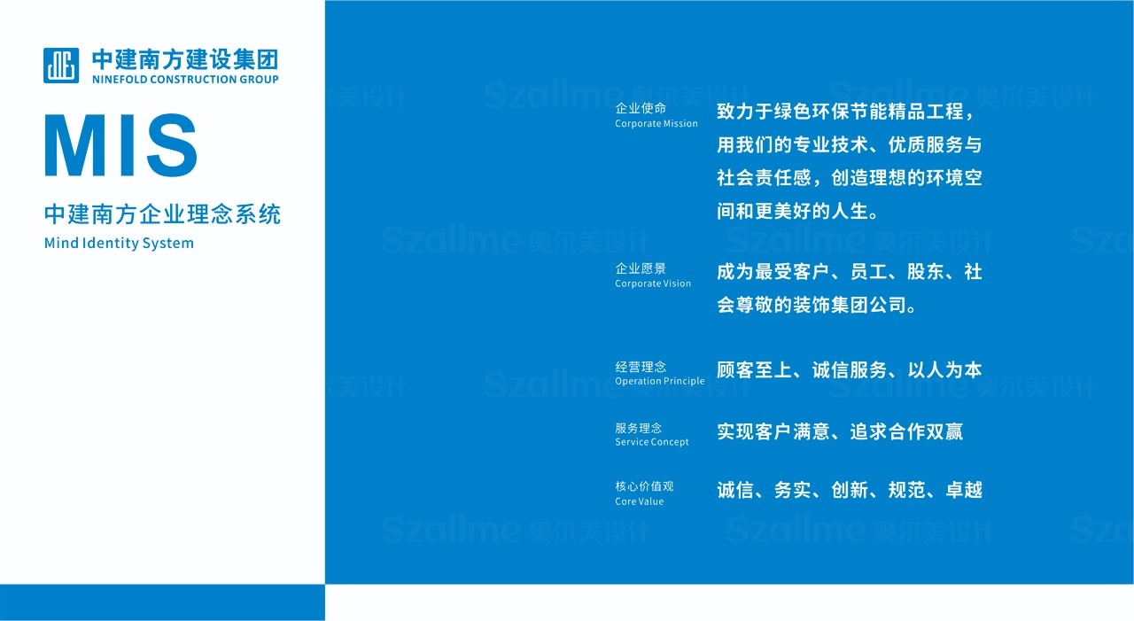 原有的公司视觉形象不系统,在对内对外宣传物料设计中没有品牌调性,企业文化展示比较弱,项目地缺乏统一的视觉管理,因此与奥尔美的强力合作,打造CIS品牌新形象, 同时要为中建南方做系统的CI应用培训,严格规范VI系统的使用。