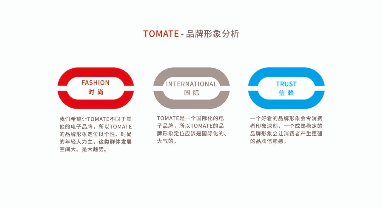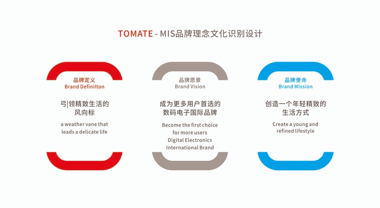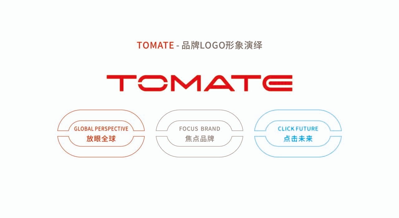 为了突显竞争力、与同行形成差异。在品牌形象设计过程中,借鉴其名英文名称一一“TOMATE”为创作元素,全新的品牌识别设计力求国际化、高品质,整体色调清新简约,平易近人,投射创新、年轻、活力的品牌形象,以反映独特的品牌DNA及理念,加强品牌与顾客的情感联系。在字体设计上,修饰的更加圆润,并结合了"放眼全球"焦点品牌"体现"视野成就品牌"的概念。全新的LOGO更加年轻,时尚与国际.化。细节处理也体现品牌的品质与追求,正如TOMATE的产品兼具时尚感和优质性。