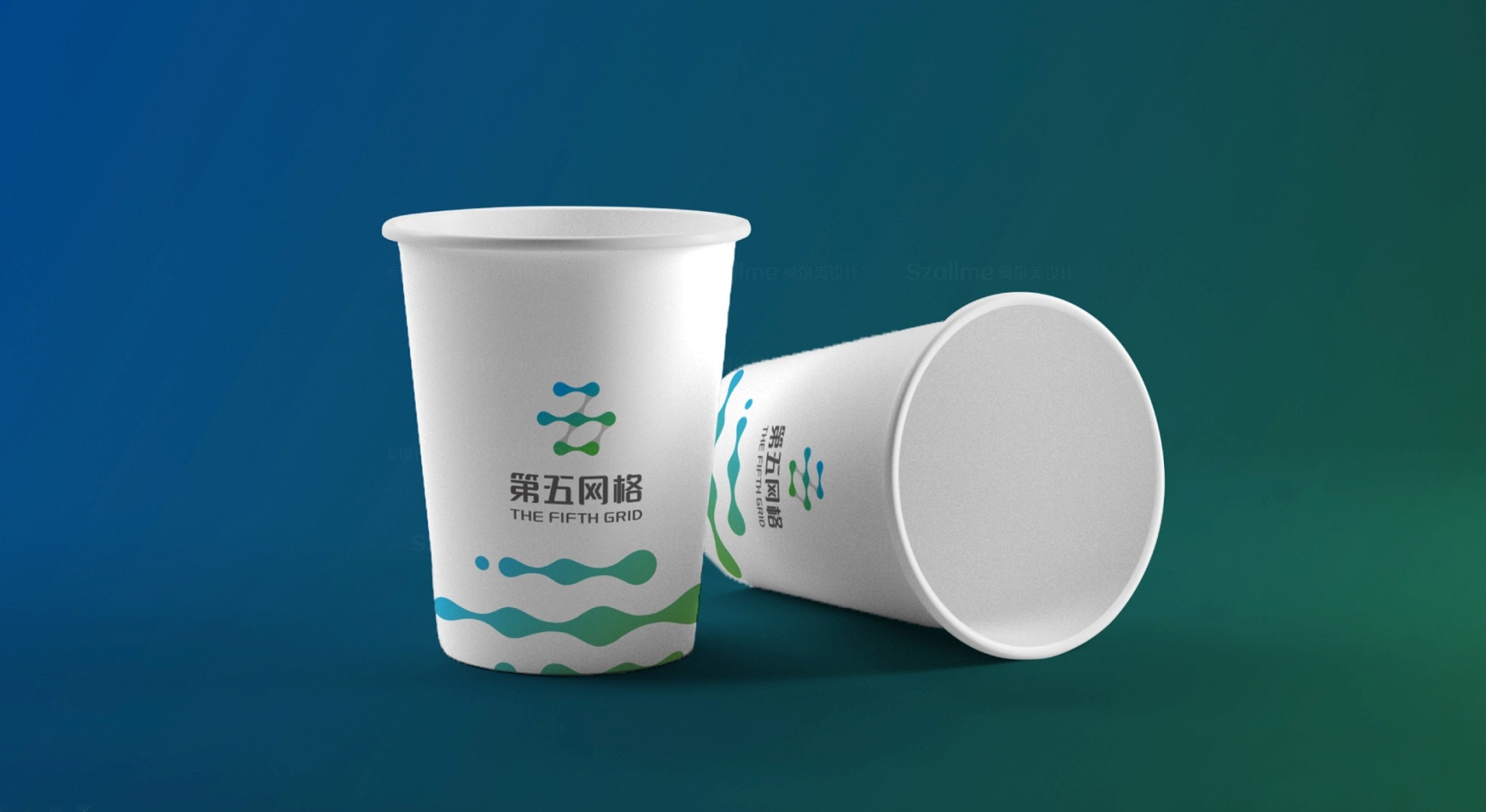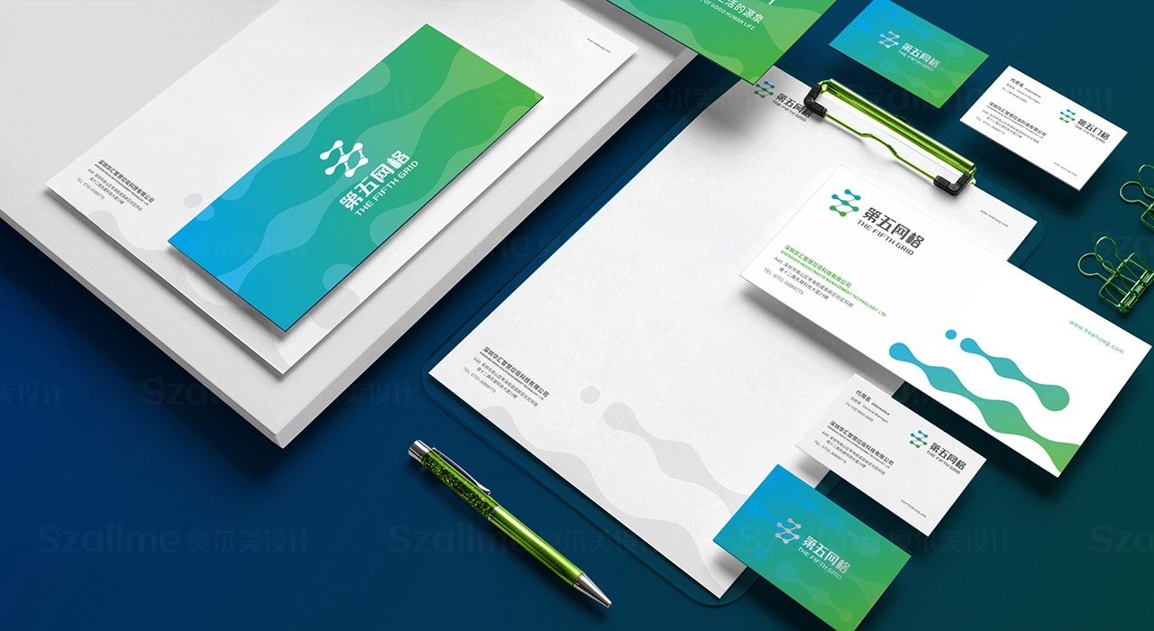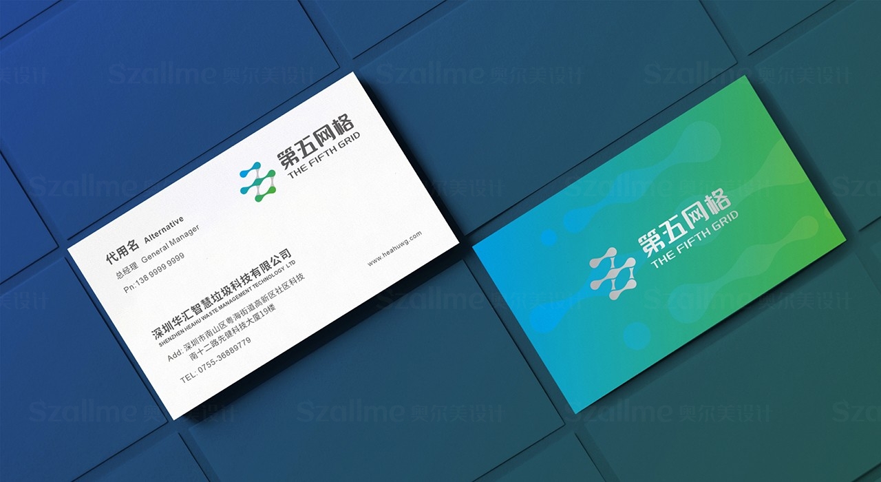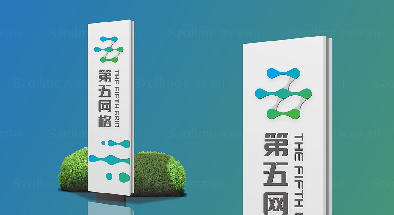 品牌设计以科技、环保、智慧、创新的理念进行创意设计,蓝色代表科技与智慧,绿色代表环保与创新,渐变色代表第五网格的环保领先理念。标志造型有智慧、环保、联动的视觉感。