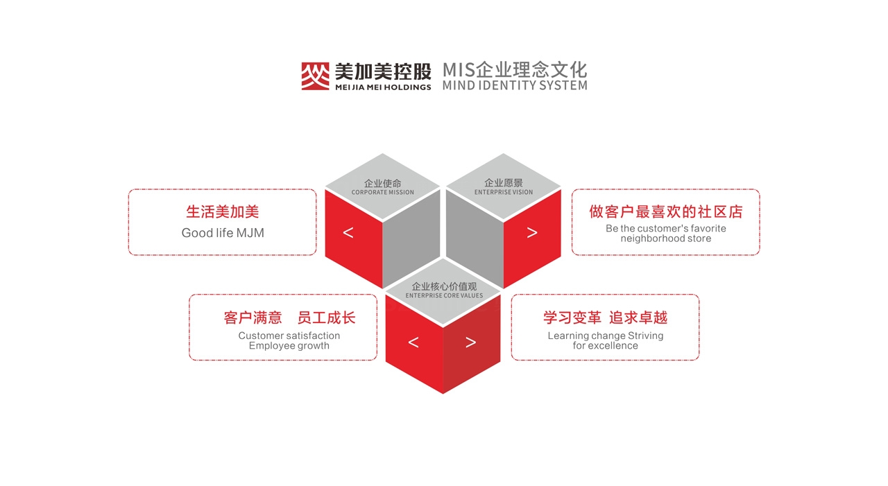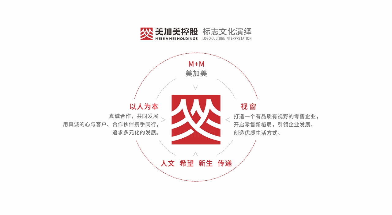 美加美控股品牌为了突显竞争力、与同行形成差异。在品牌形象设计过程中,借鉴其名英文名称“MEI JIA MEI"中的首母“M+M" 创作元素,全新的品牌识别设计力求国际化,整体简约,平易近人,投射创新、年轻、活力的品牌形象, 体现公司稳健发展和品牌领先的企业形象。