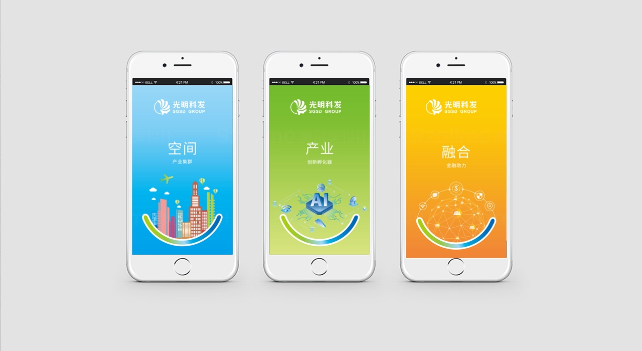 标志主视觉元素是科发在光明99平方公里地图的项目板块形象,代表我们科发的个性魅力和唯一性;将标志设计元素汇聚成地图分别代表科发的空间、金融、服务、平台和创新节点;