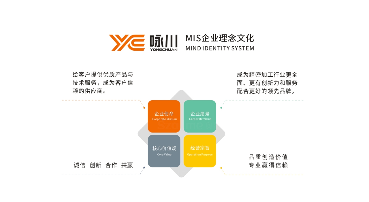 咏川致力于高端精密慢走丝生产与研发,为客户提供好的产品和技术支持、健全的售后服务,高效的整体解决方案,为客户创造价值。为了突显品牌竞争力、与同行形成差异。在品牌形 象设计过程中,借鉴其名英文简称--“YC”为创作元素,全新的品牌识别设计力求国际化、与高品质。