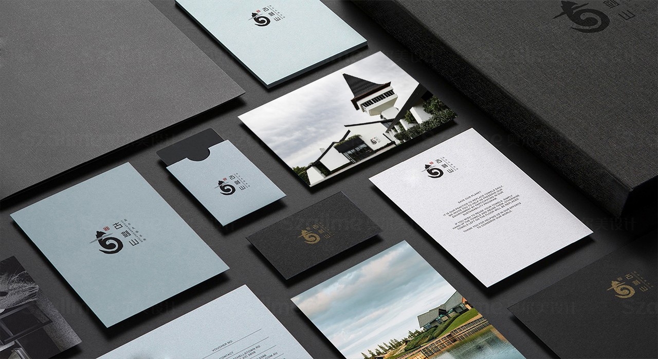 LOGO以“古”字、山、果岭旗、太极图、庙宇、印章为设计元素。