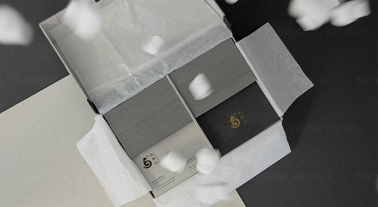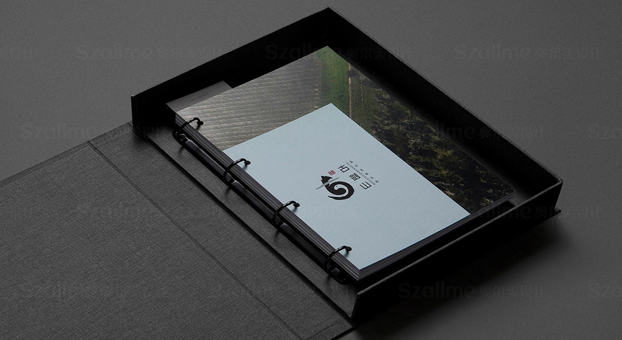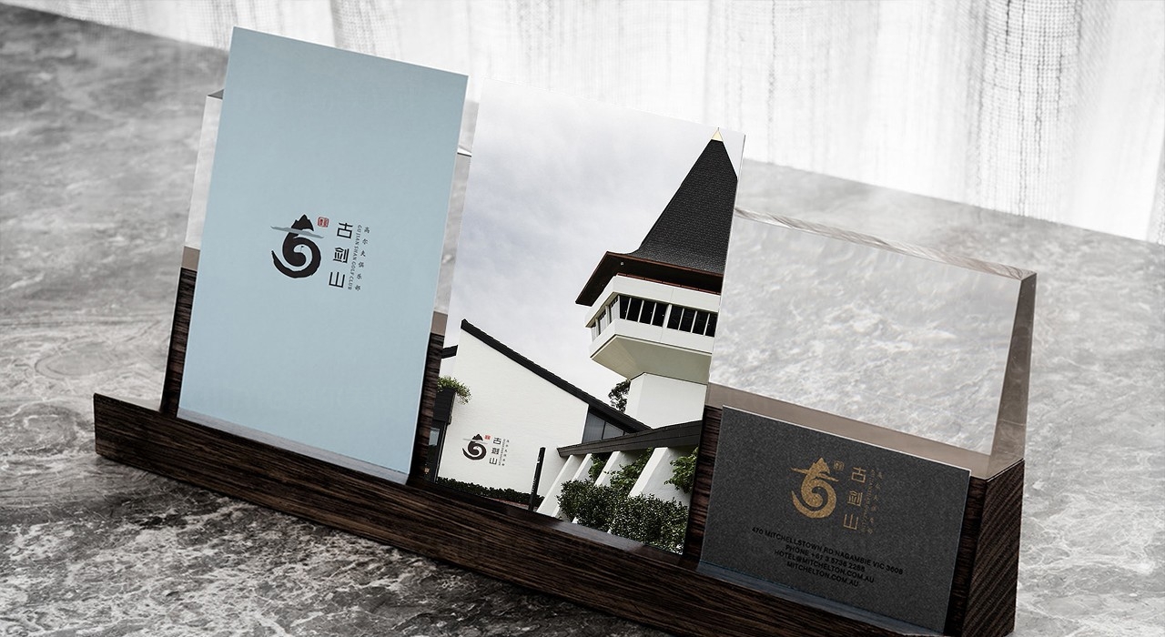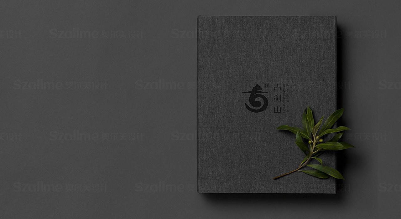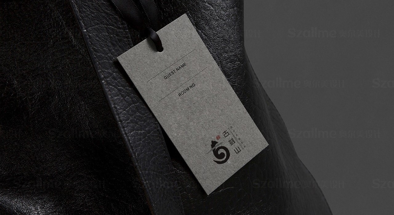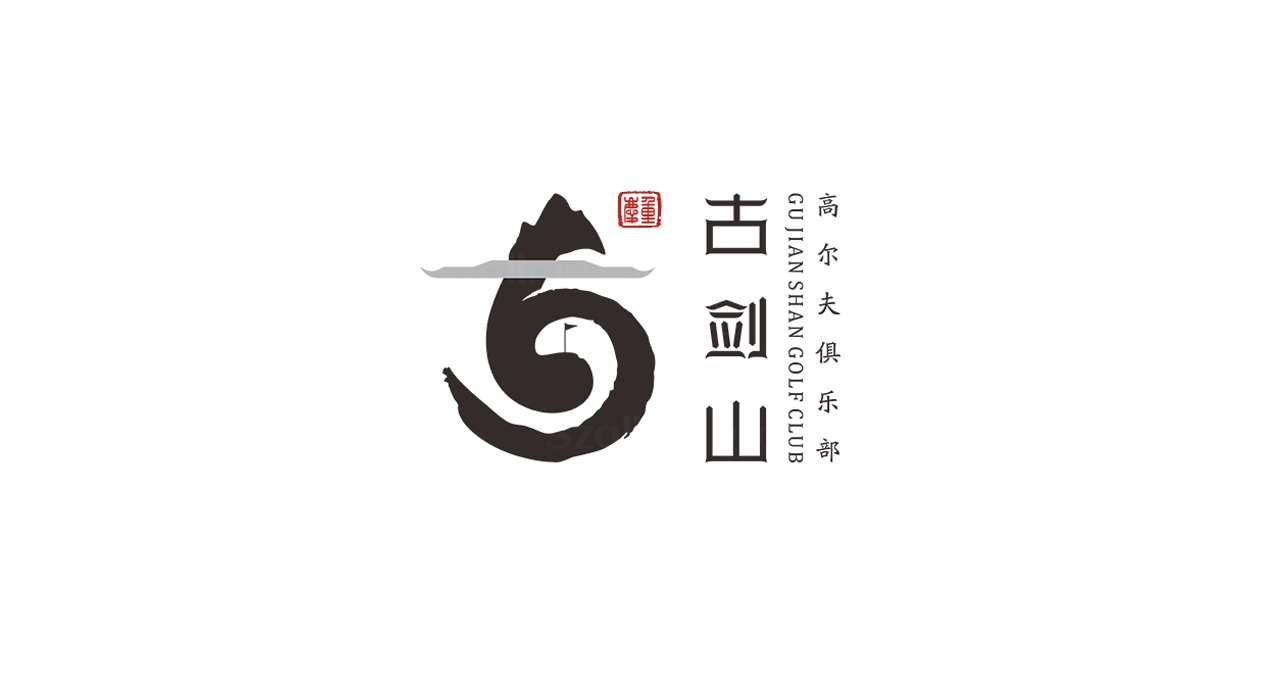“古”字体现古剑山的品牌名称,有直观的识别性,山峰、太极图与庙宇建筑融入到古字,增加了自然景观与道教的仙气,果岭旗在视觉中心,体现高尔夫行业特点,让人感受天人合一的意境,印章视觉传承了中国人文精神和厚德致远。